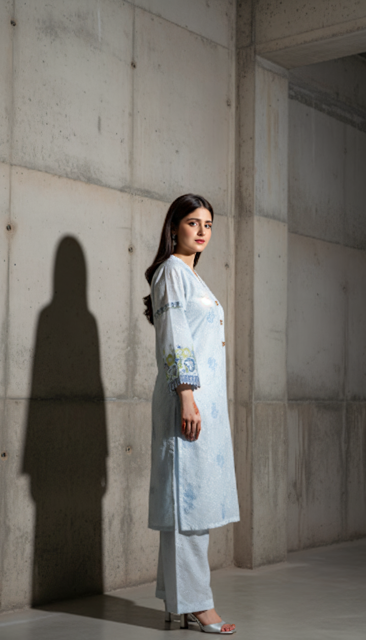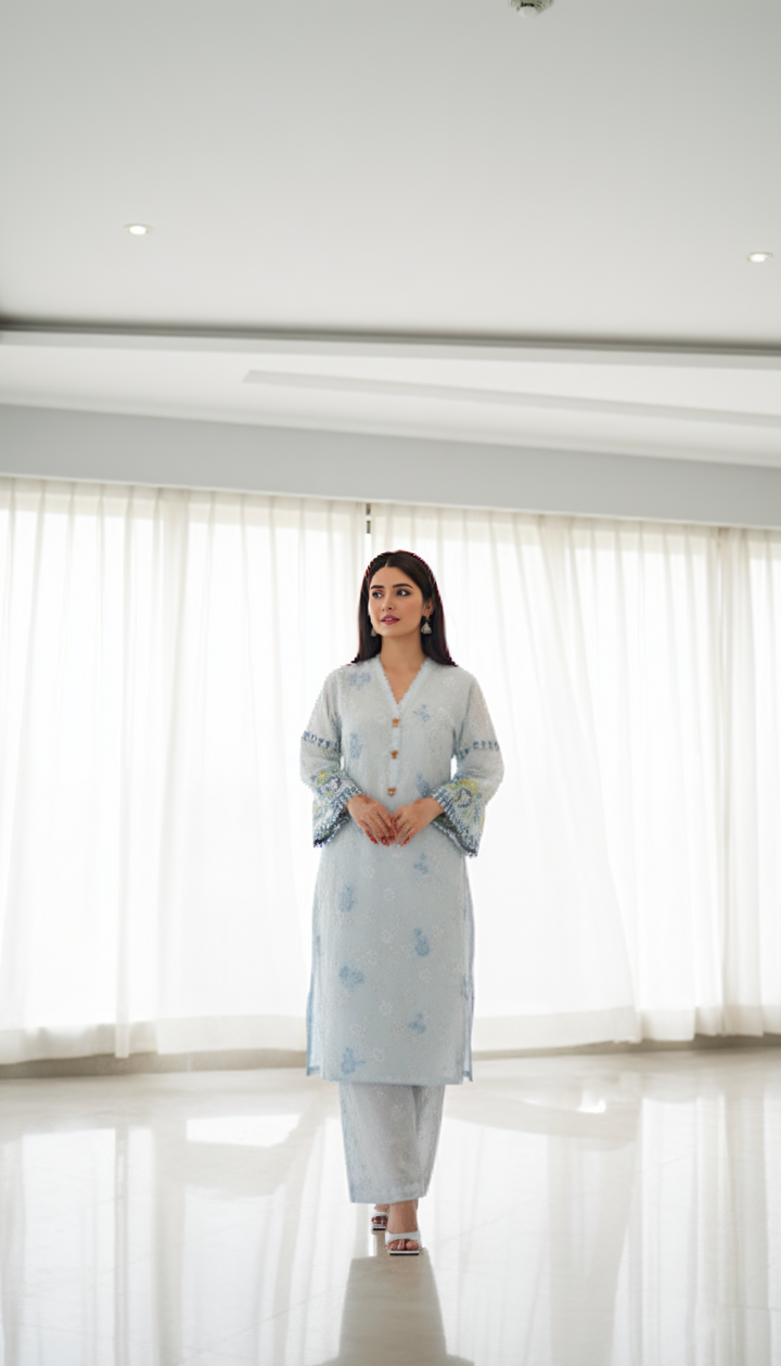 Fresh, breezy, and effortlessly elegant — this 2-piece embroidered co-ord set in a soothing light blue is made for summer days. Crafted from premium imported lawn fabric, it offers lightweight comfort and refined style, perfect for staying cool while looking polished. Featuring delicate embroidery and embellishments on the neckline and sleeves, this outfit brings subtle sophistication to your seasonal wardrobe.